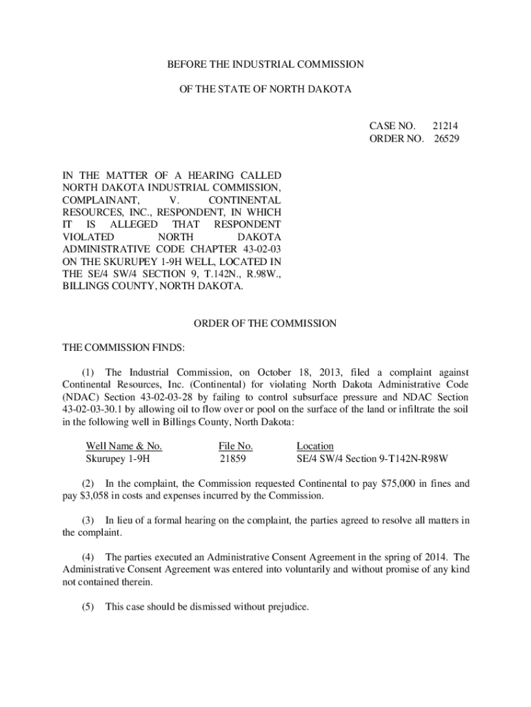This document is a formal complaint issued by the North Dakota Industrial Commission against Continental Resources, Inc. The complaint alleges violations of the North Dakota Administrative Code related