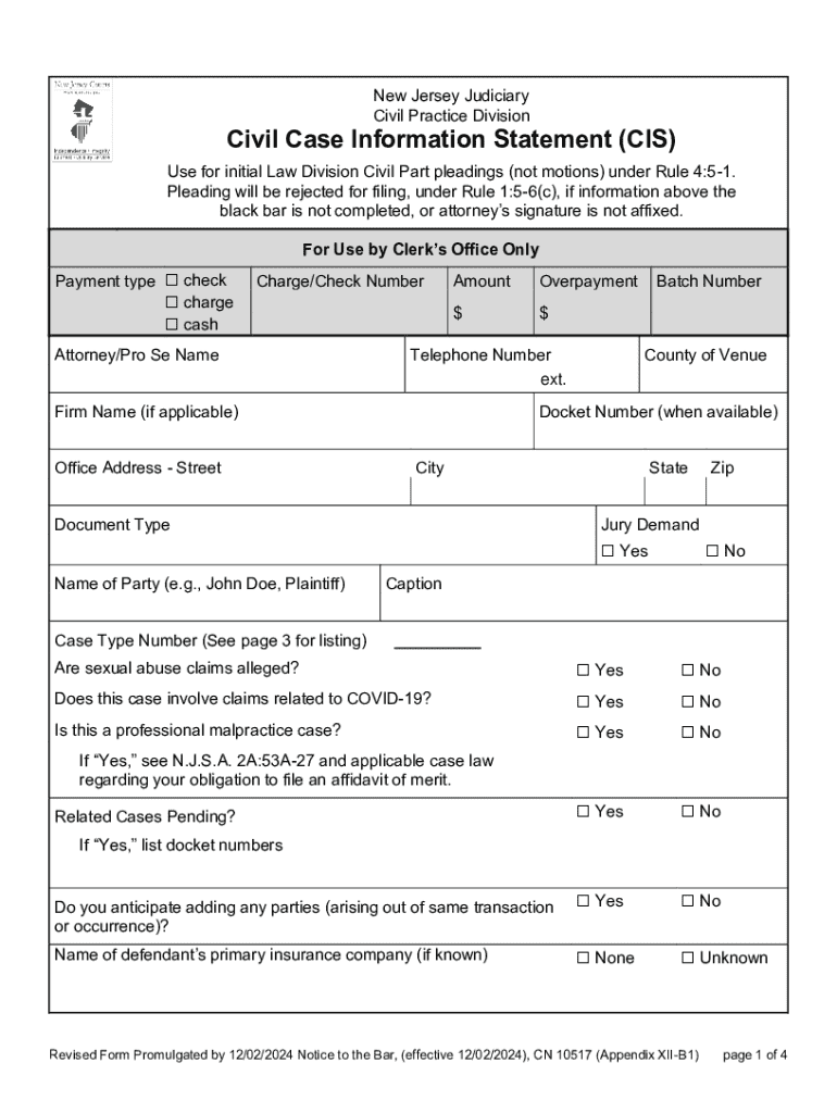 Use for initial Law Division Civil Part pleadings (not motions) under Rule 4:5-1. Pleading will be rejected for filing if information above the black bar is not completed, or attorney’s signature