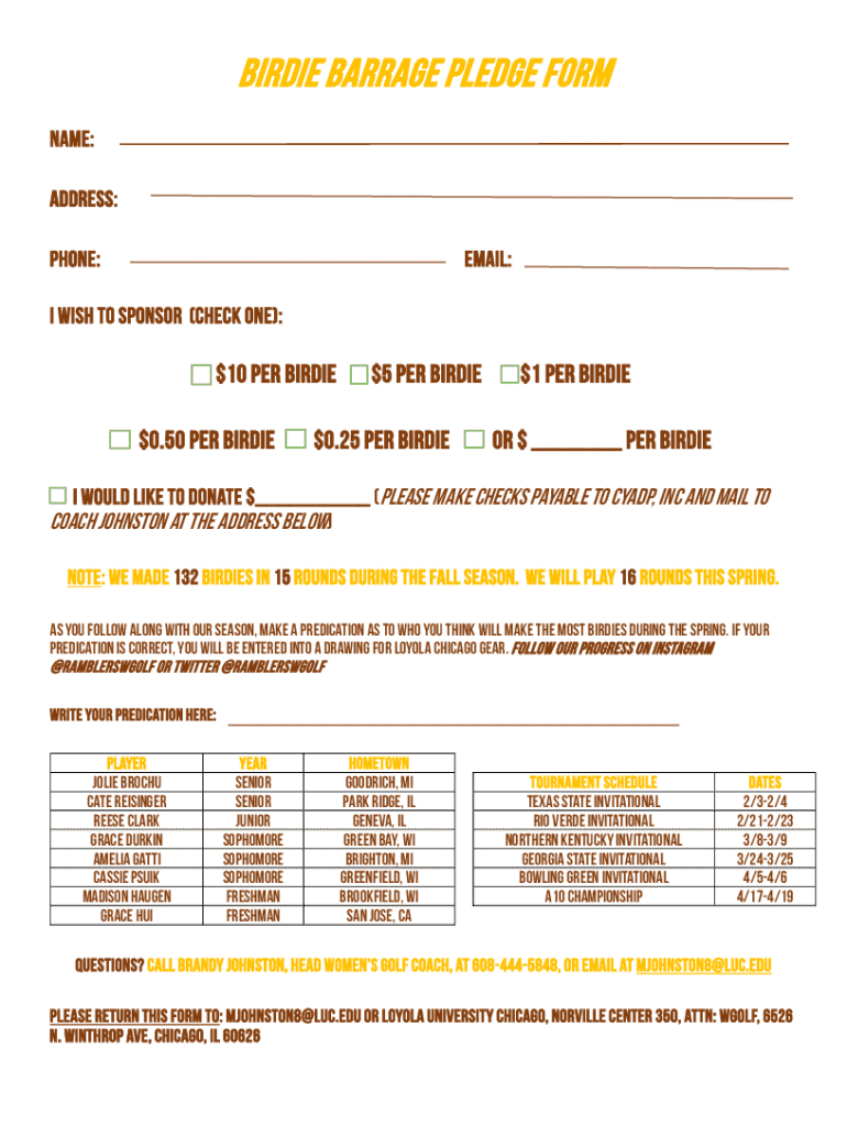 This form allows sponsors to pledge an amount per birdie made by the Loyola Chicago Women’s Golf Team during their spring season, with proceeds supporting the Coalition for Youth/Adult Diversion