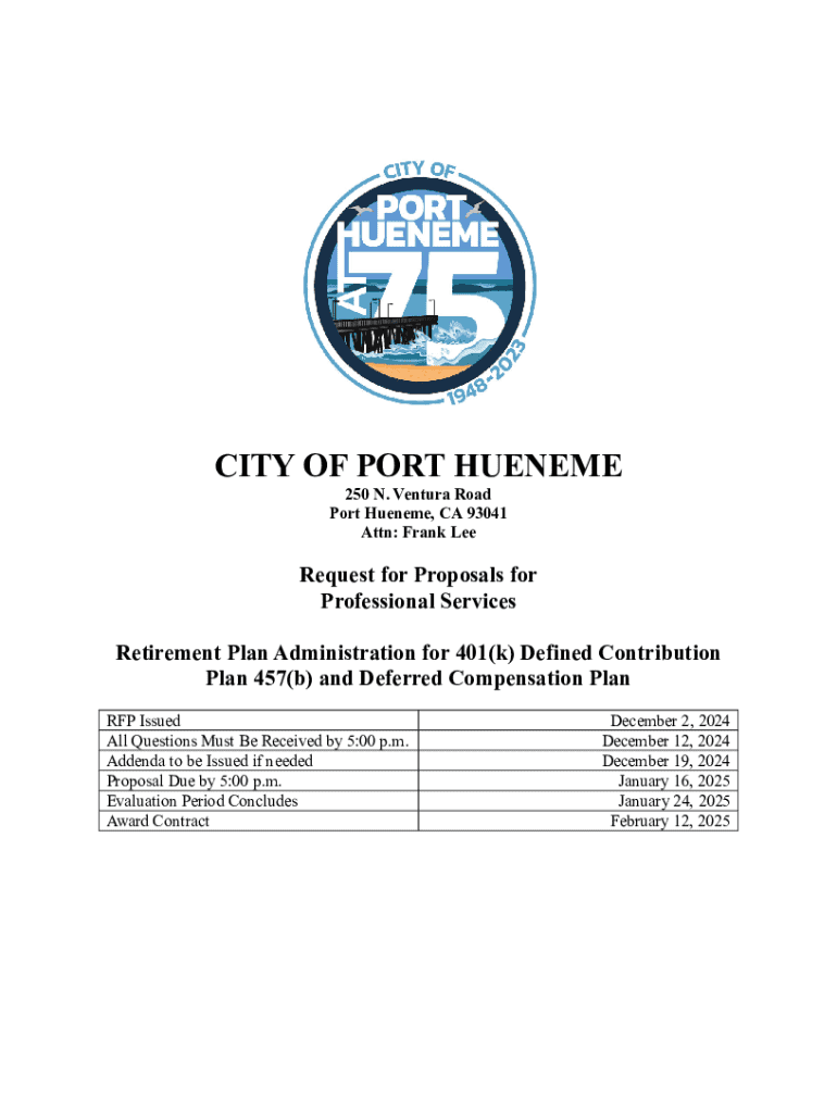 CITY OF PORT HUENEME 250 N. Ventura Road Port Hueneme, CA 93041 Attn: Frank LeeRequest for Proposals for Professional Services Retirement Plan Administration for 401(k) Defined Contribution Plan 457(b)