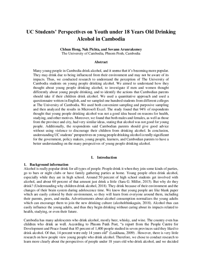 UC Students Perspectives on Youth under 18 Years Old Drinking Alcohol in Cambodia Chhun Hong, Nak Pichta, and Sovann Arunraksmey The University of Cambodia, Phnom Penh, Cambodia Abstract Many young