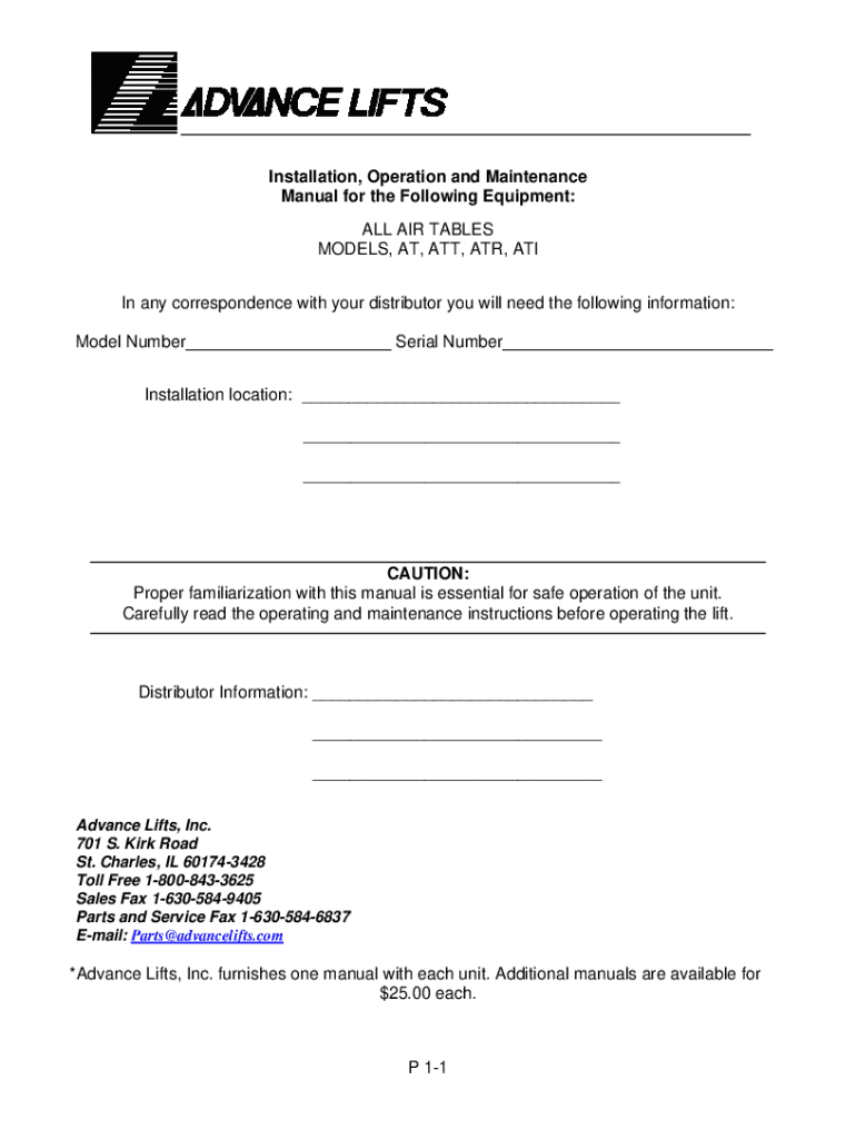 Installation, Operation and Maintenance Manual for the Following Equipment: ALL AIR TABLES MODELS, AT, ATT, ATR, ATI In any correspondence with your distributor you will need the following information: