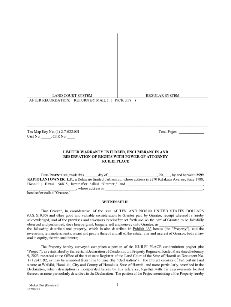 LAND COURT SYSTEM AFTER RECORDATION: RETURN BY MAIL ( ) PICK UP ( )Tax Map Key No. (1) 27022:051 Unit No. ___; CPR No. ___REGULAR SYSTEMTotal Pages: ___LIMITED WARRANTY UNIT DEED, ENCUMBRANCES AND