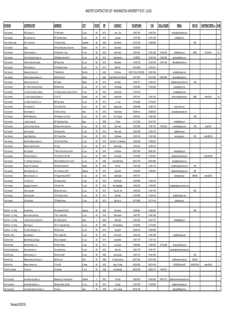MASTER CONTRACTOR LIST WASHINGTON UNIVERSITY IN ST. LOUISDIVISIONCONTRACTORADDRESSCITYSTATEZIPCONTACTTELEPHONEFAX1 Gen ContractorACME Erectors, Inc.7212 Weil Avenue1 Gen ContractorBSI Constructors,