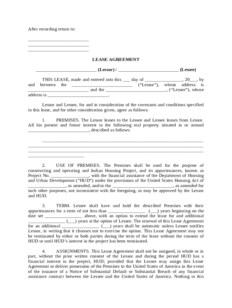 This form is a lease where the premises shall be used for the purpose of constructing and operating and Indian Housing Project.