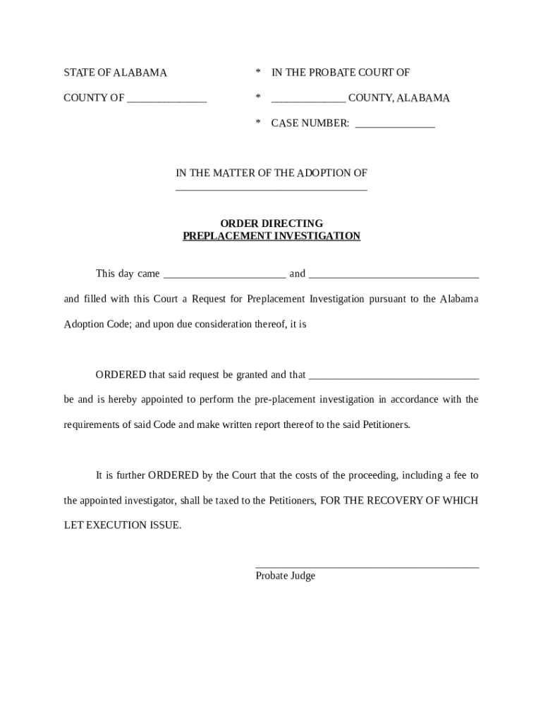 An order directing pre-placement investigation is a legal document initiated in adoption cases that mandates an investigation into the prospective adoptive parents and the adoptive process. Its importance lies in ensuring the safety and suitability of the adoptive family, which is vital for the welfare of the child. In Alabama, specific state regulations govern this process.