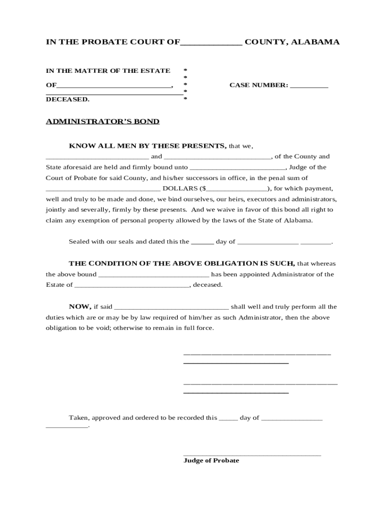 Administrator bonds are required in various scenarios, particularly when a probate court mandates one for the appointment of an administrator. In Alabama, if an estate includes minor beneficiaries, has substantial assets, or involves complicated asset management, a bond is often compulsory. Individuals typically required to secure an administrator bond include designated administrators and executors of estates.