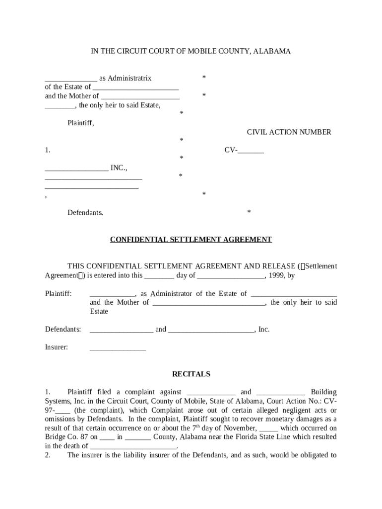 A confidential settlement agreement outlines the terms under which a plaintiff agrees to relinquish their claims against a defendant, often in exchange for monetary compensation.