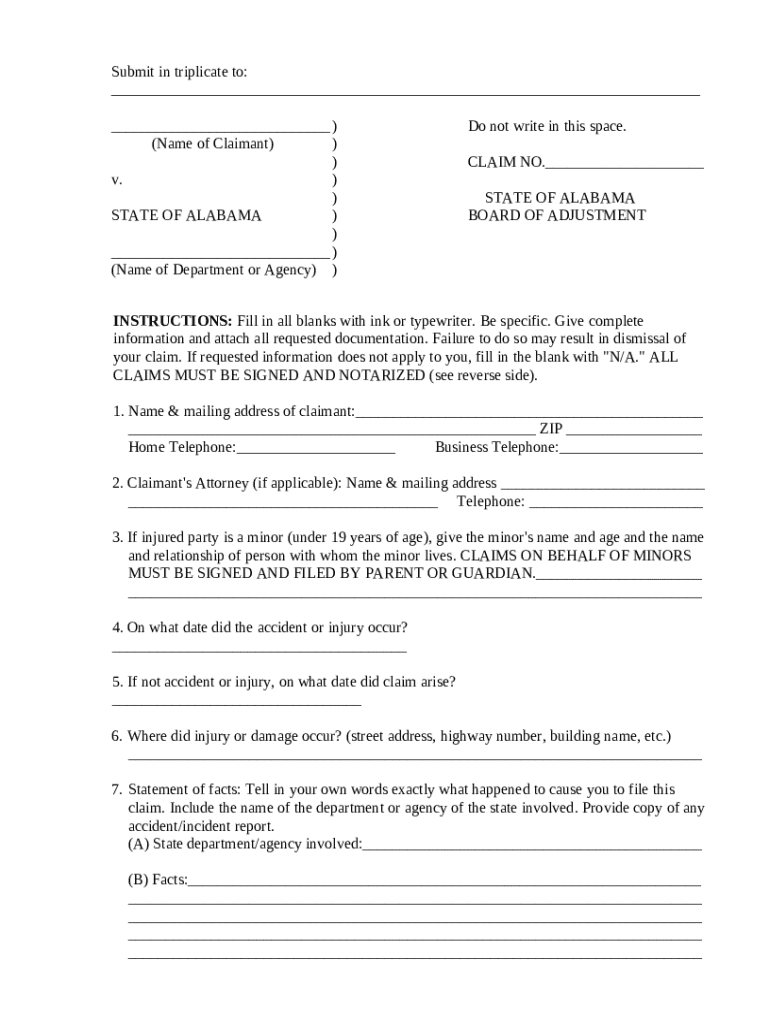 Get the free Claim to State of Alabama Board of Adjustment for Personal Injury template