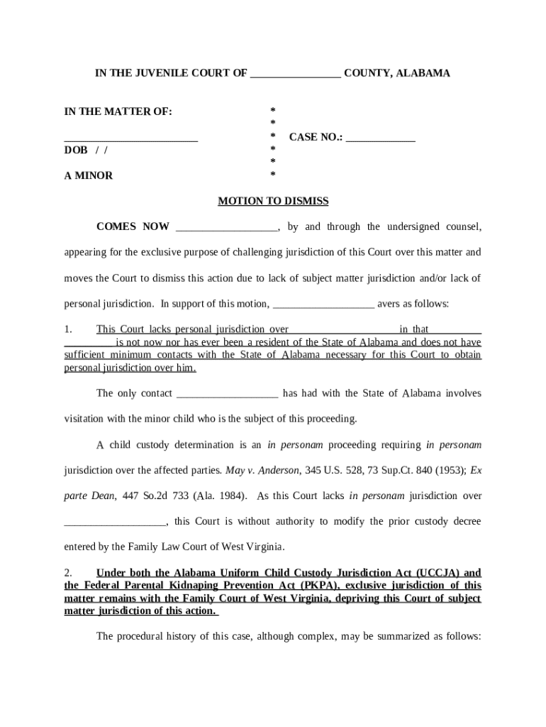 Alabama’s Uniform Child Custody Jurisdiction Act (UCCJA) is crucial for understanding how local laws interact with filing a motion to dismiss. Additionally, federal laws like the Parental Kidnapping Prevention Act (PKPA) can influence jurisdictional claims. Familiarizing yourself with these local regulations ensures you are well-prepared when navigating the motion to dismiss process in Alabama.