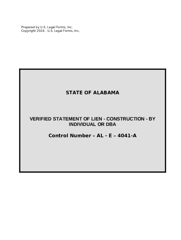 This Alabama Verified Statement of Lien for Construction Work is executed by an individual, or dba, who claims unpaid work, skills or materials on a particular piece of real property.