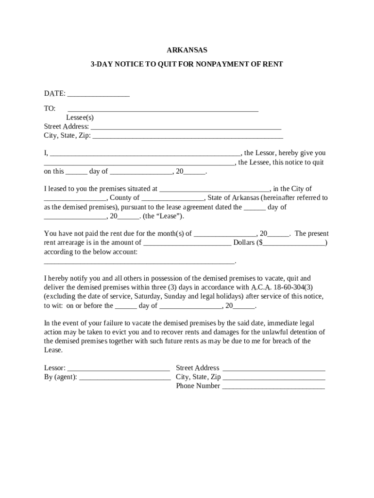 The three 3 day notice to quit form serves as an essential communication tool between landlords and tenants when there is an issue regarding unpaid rent. This legal notice informs the tenant that they must vacate the property within three days if they do not pay their rent. In Arkansas, a landowner may issue this notice as a precursor to potential eviction proceedings.