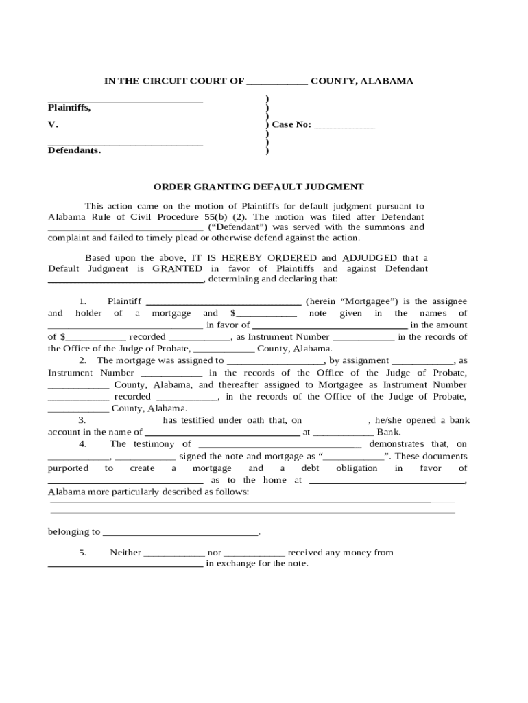 This order grants a default judgment in favor of a Mortgagee, pursuant to Alabama Rule of Civil Procedure 55(b)(2), following failure of the Defendant failed to timely please or otherwise defend the