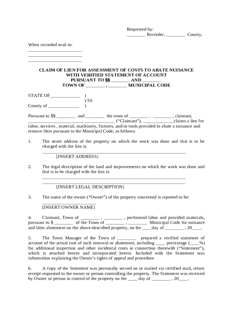 This notice follows a written demand for payment of assessments, claims a lien for labor, services, material, machinery, fixtures, and/or tools provided to abate a nuisance and remove litter pursuant