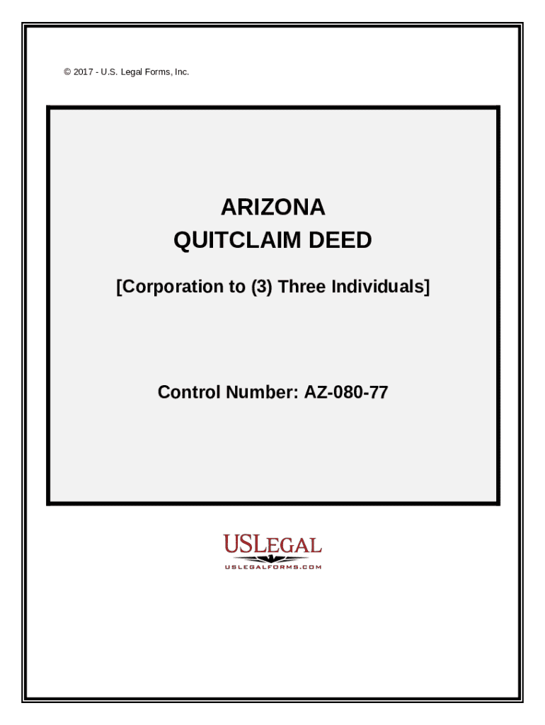 This form is a Quitclaim Deed where the Grantor is a corporation and the Grantees are three individuals. Grantor conveys and quitclaims the described property to Grantees. This deed complies with