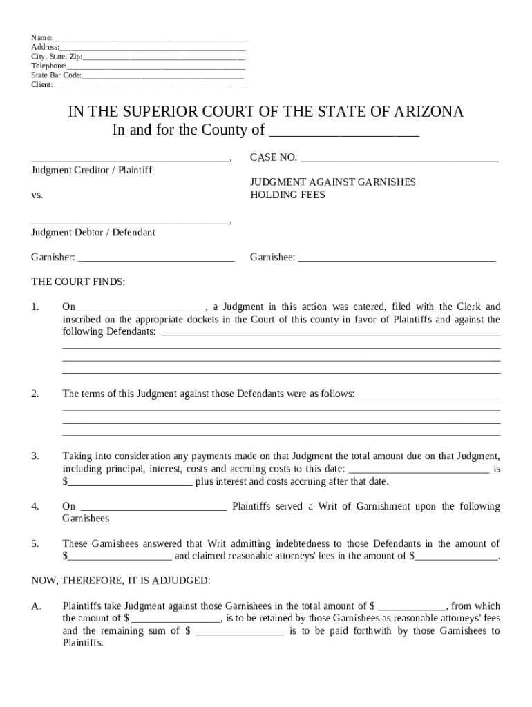 This is a model Judgment form, a Judgment Against Garnishee Holding Funds. The form must be completed to fit the facts and circumstances of whatever judgment the court has rendered. When signed by