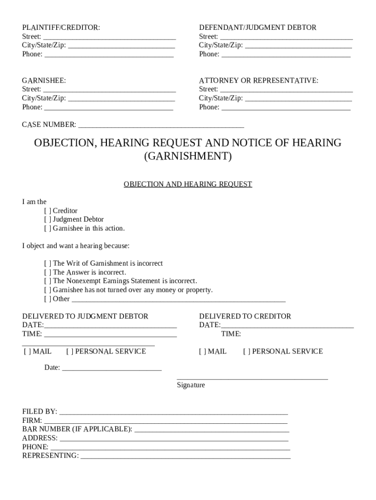 Objection, Request and Notice of Hearing: An Objection to Garnishment Amount, as well as the subsequent Request and Notice of Hearing, may be used by either the Debtor or Creditor. These documents