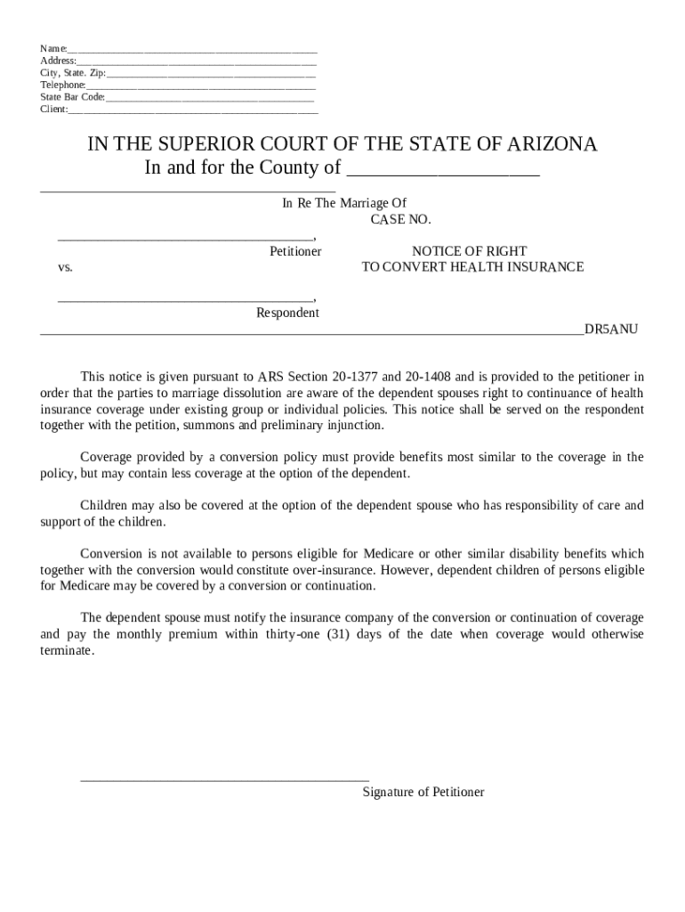 A Notice of Right to Form is a crucial legal document that signifies an individual’s rights regarding health insurance continuation during significant life transitions, such as marriage dissolution. Essentially, it lays the foundation for informing parties involved about their entitlements and obligations. This notice becomes essential during the context of legal separation or divorce, ensuring that both parties are aware of their rights regarding health insurance coverage.