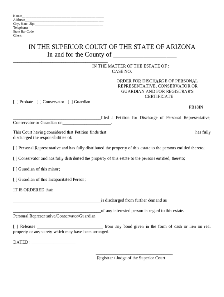 An Order for Discharge is a legal document that allows individuals such as personal representatives, conservators, or guardians to close their responsibilities officially. The primary purpose of this order in Arizona is to affirm that the individual has fulfilled their duties and liabilities concerning the estate or the individual under their care.