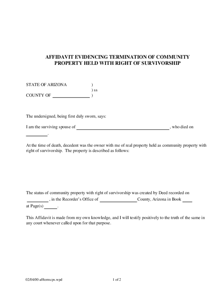 This form is an affidavit evidencing the survivorship of the spouse of the decedent and testifying to his/her right to the real property. This is an official form from the Arizona Court System,