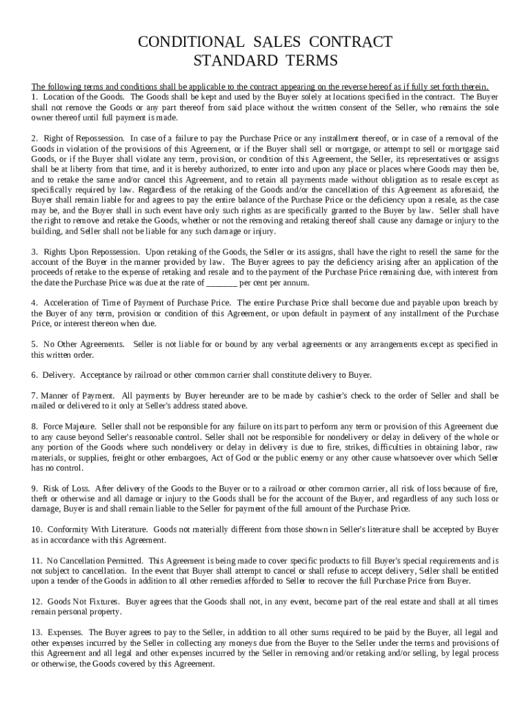 Conditional Sales Contract: A Condiitonal Sales Contract states that the Buyer or Seller can be relived of his/her duites concerning the contract, if the specified conditions are not met. Both the