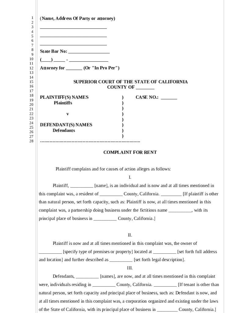 A complaint for rent due is a legal document filed by a landlord to initiate eviction proceedings against a tenant who has not paid their rent.