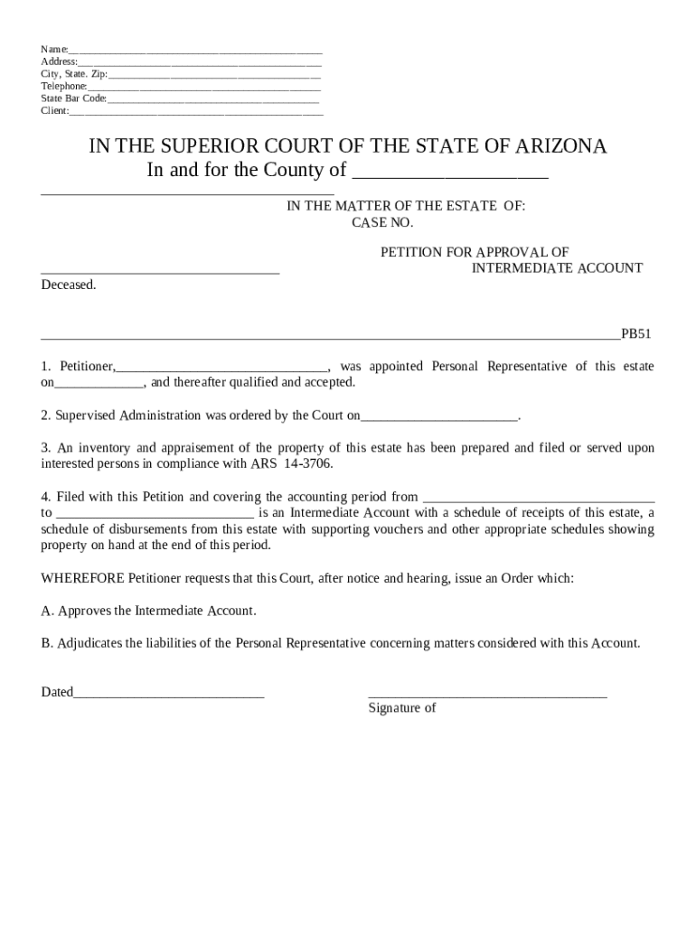 This model form, a Petition for Approval of Intermediate Account - Arizona, is intended for use to initiate a request to the court to take the stated action. The form can be easily completed by filling
