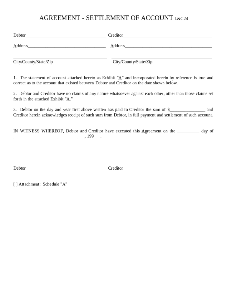 Settlement of Account: A Settlement of Account states that the Buyer and Seller previously had entered into a contract with one another; however, that contract has been fulfilled by both parties.