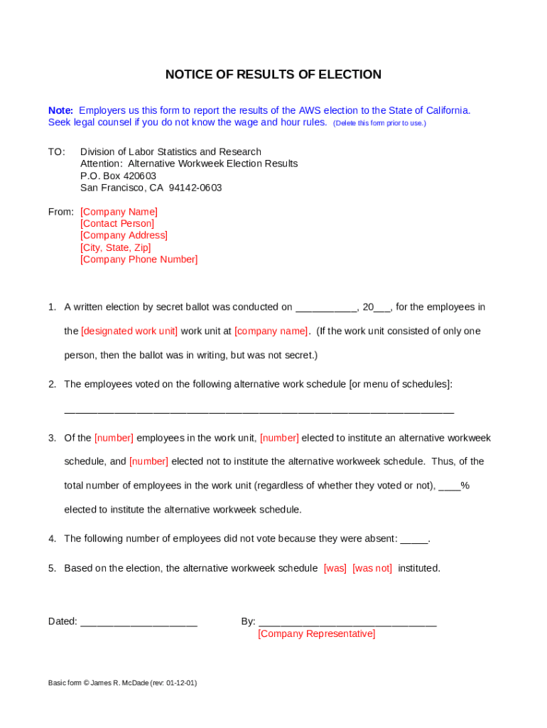 Employers use this form to report the results of the Alternative Workweek Schedule election to the Division of Labor Statistics and Research, State of California.