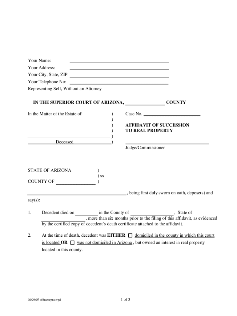 This form is an affidavit of succession for the decedent_x0019_s real property. This is an official form from the Arizona Court System, which complies with all applicable laws and statutes. USLF