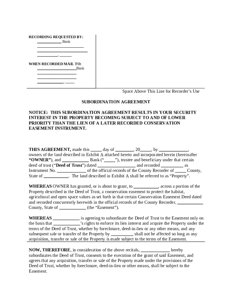 Filling out a subordination agreement for conservation involves understanding the document’s significance within real estate and conservation practices. A subordination agreement ensures that a conservation easement takes precedence over existing financial encumbrances, which can significantly impact property development and conservation goals.