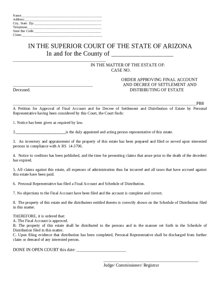 An order approving final account is a legal document that confirms the final accounting of an estate or trust and authorizes its distribution.