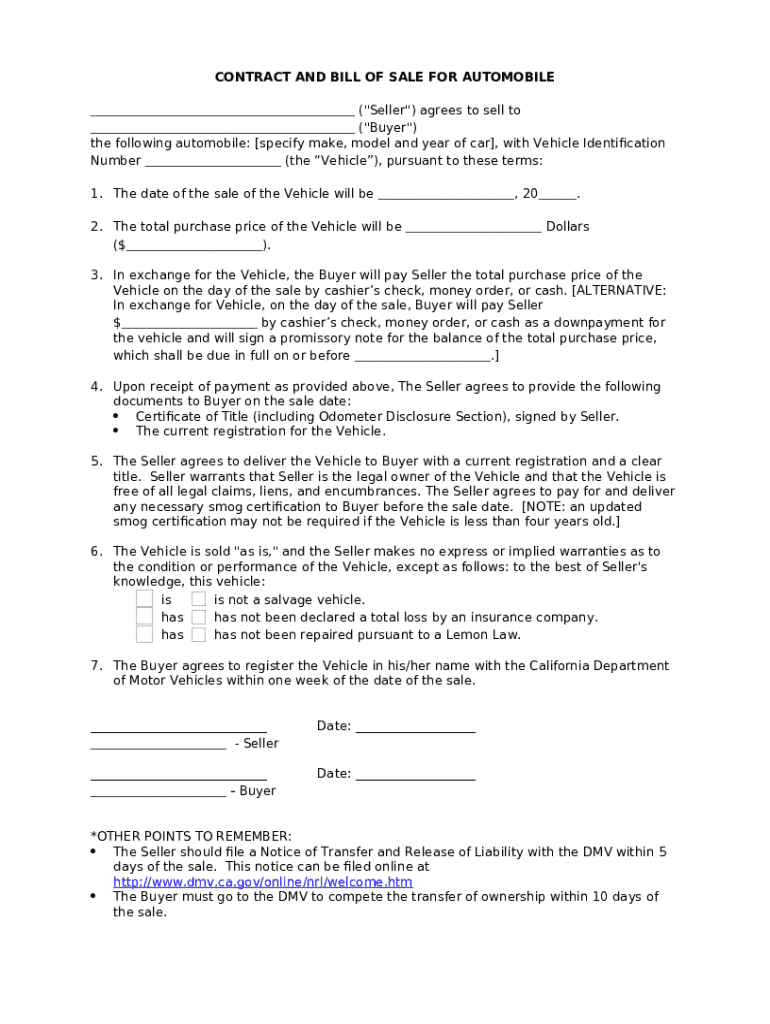The parties in this contract agree to the terms of a sale of a automobile and the seller signs a bill of sale to demonstrate the transfer of ownership to the buyer.