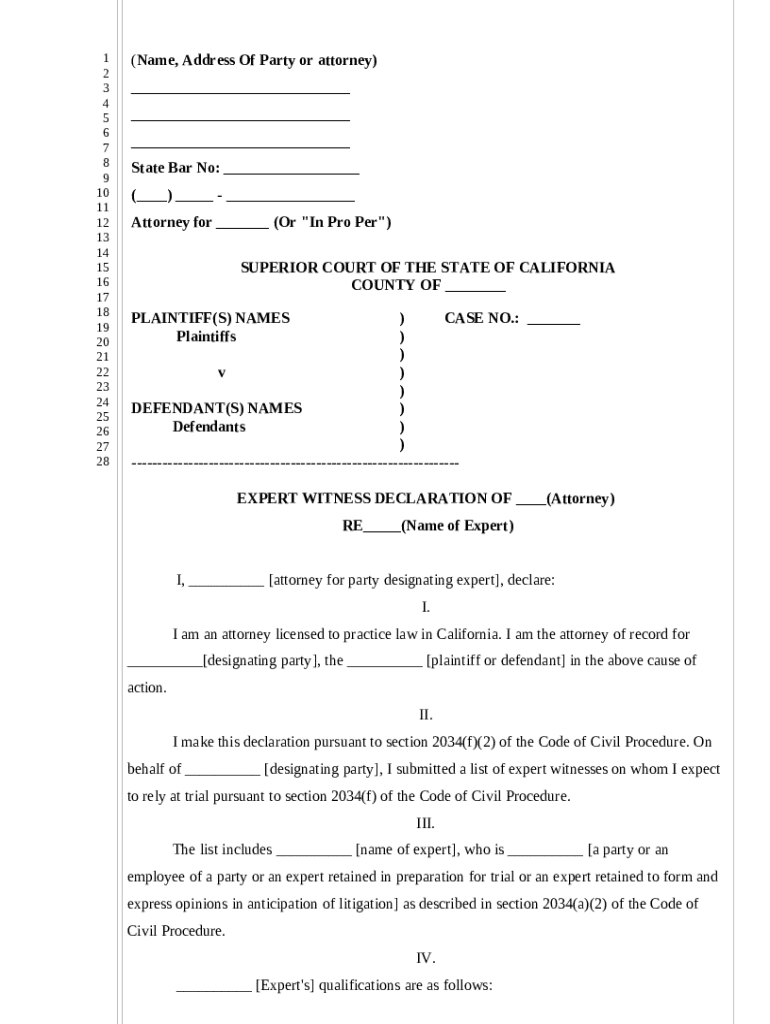 Filling out an expert witness declaration form requires careful attention to detail. Each section must be completed accurately to avoid potential legal issues that could arise from incomplete information.