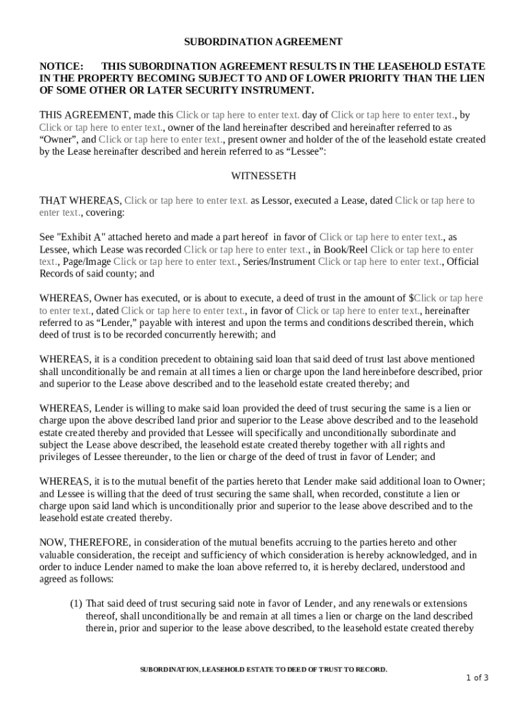 A subordination agreement serves to clarify the priorities of claims, securing the rights of parties involved in a lease or loan transaction.