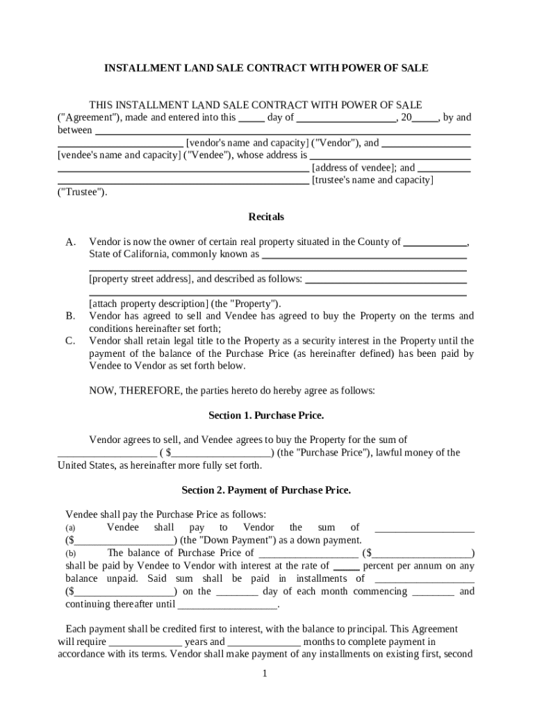 Installment Land Sale Contract with Power of Sale dealing with Vendor and Vendee. Generally, this a type of contract for the purchase and sale of real property in which the seller provides financing