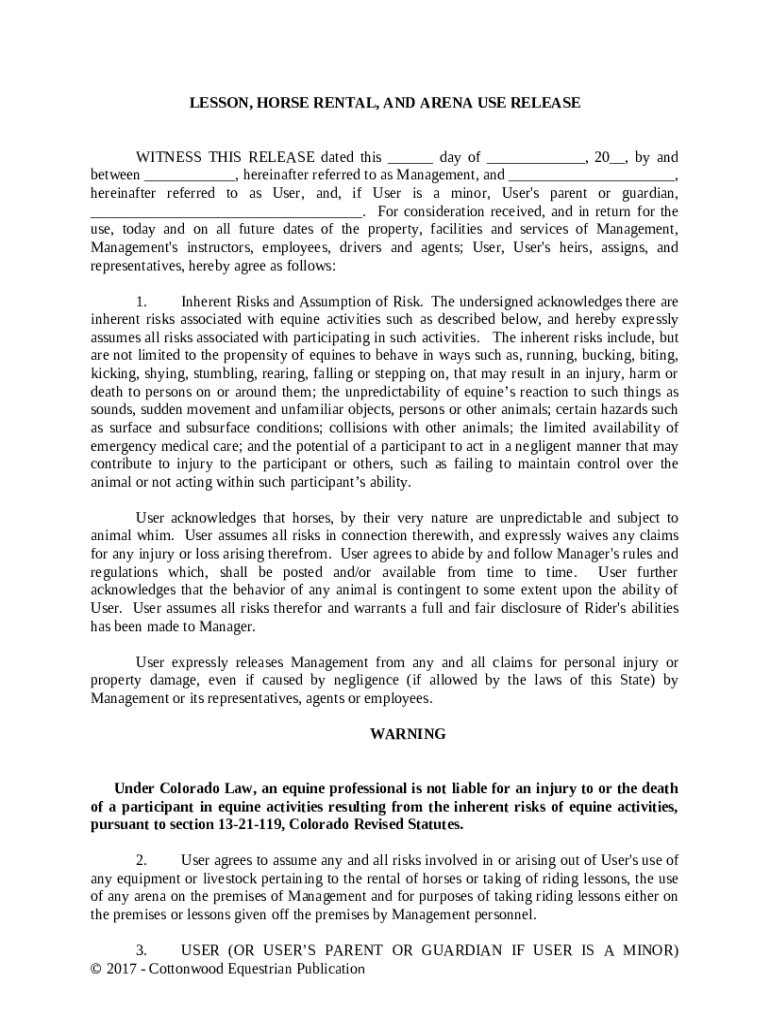 Get the free Lesson, Horse Rental or Lease, and Arena Use Release - Horse Equine s template