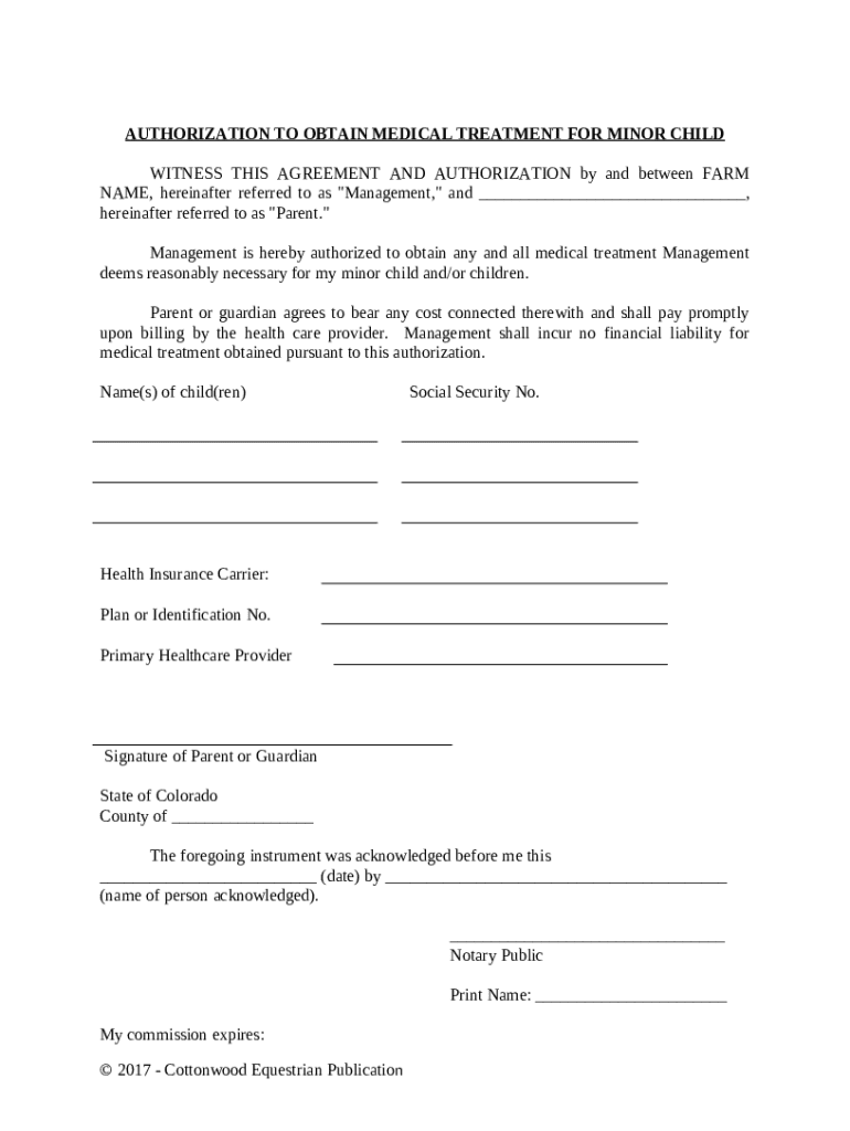 Get the free Authorization To Obtain Medical Treatment For Minor Child - Horse Equine s template