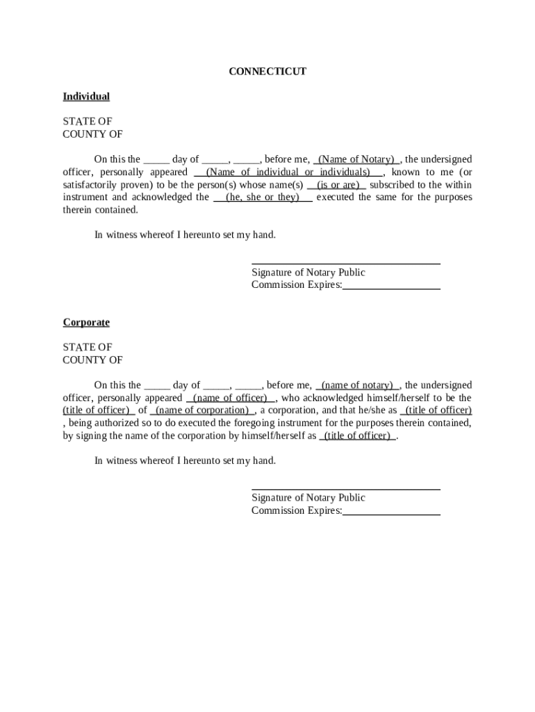 This is a Connecticut form acknowledging the signing party's signature on an instrument. A proper acknowledgment is required for any instrument that will be or may ever be recorded and all instruments