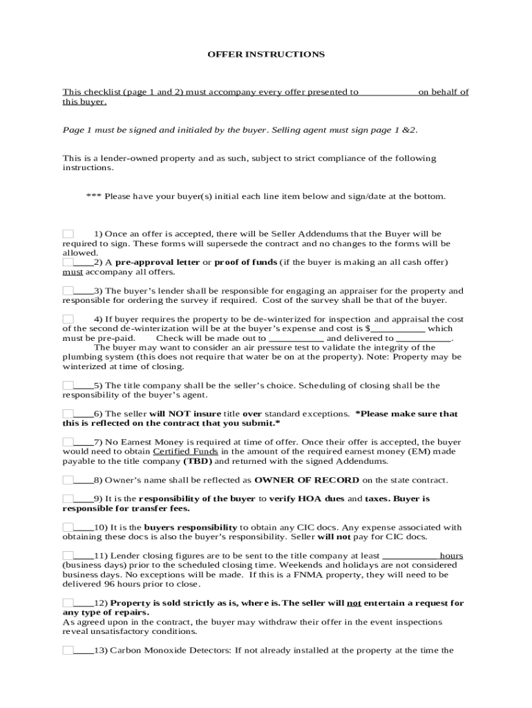 This is a sample Offer Instructions. This checklist is to accompany an offer presented on behalf of a buyer.