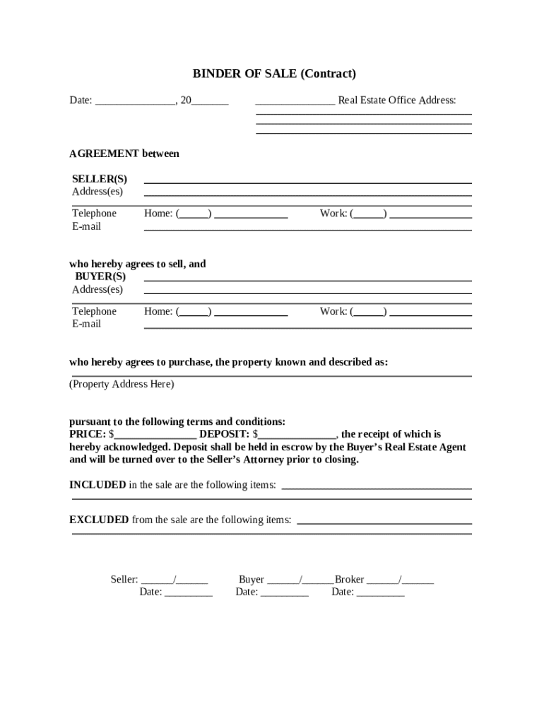 This is a sample Binder of Sale (Contract). A real estate binder refers to an informal or formal agreement between buyer and seller to indicate strong interest in a property transaction. Also a