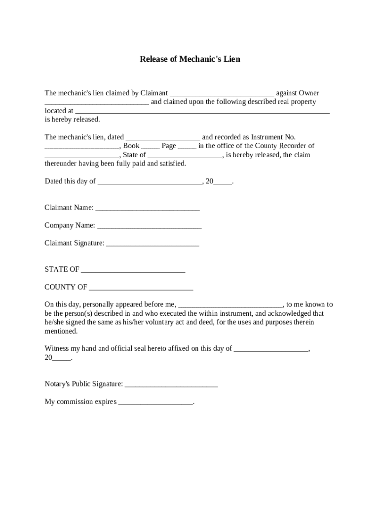 A release of mechanics lien is a document that formally relinquishes a claim against a property for unpaid construction services or materials.