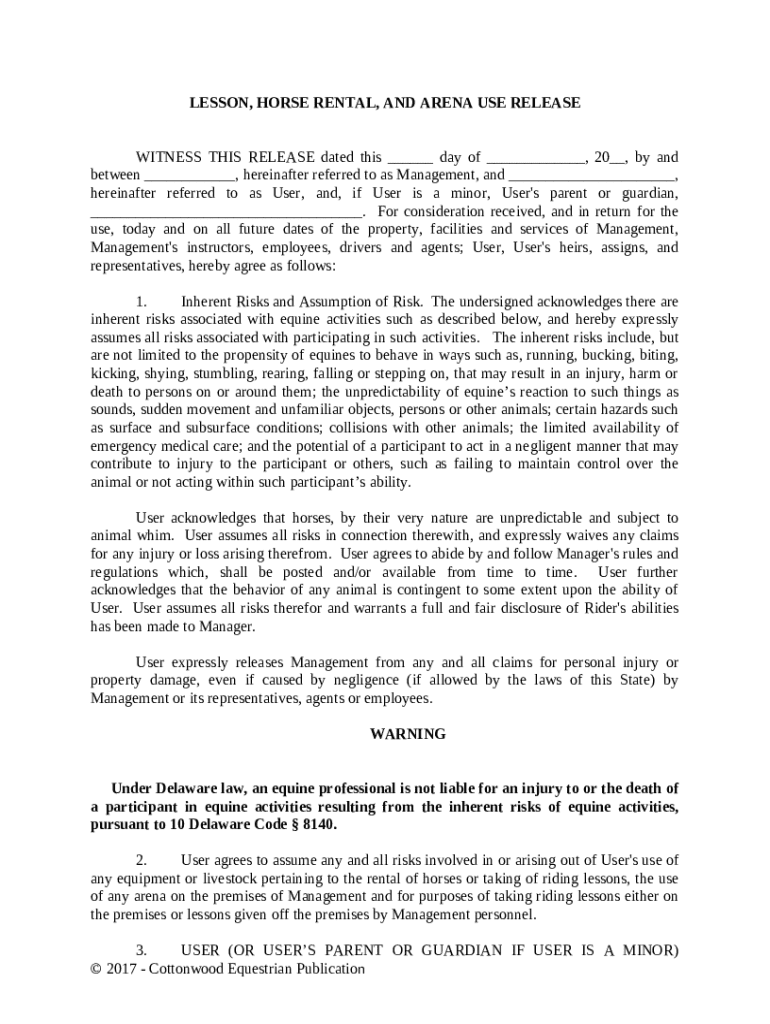 Get the free Lesson, Horse Rental or Lease, and Arena Use Release - Horse Equine s template