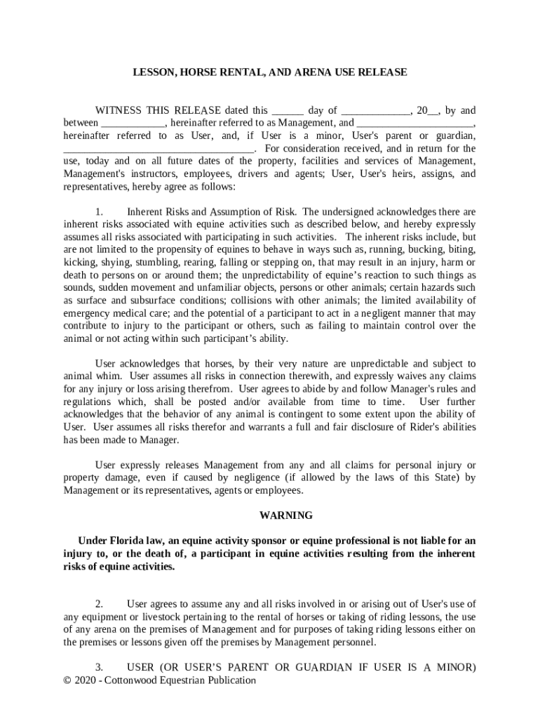 This Lesson, Horse Rental, and Arena Use Release Horse Equine Form is a lesson, horse rental and arena rental release form for a user to sign before being given lessons, or being rented a horse or