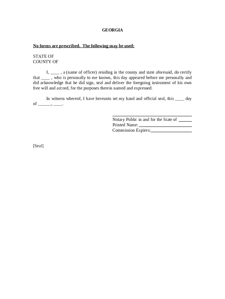 This is a Georgia form acknowledging the signing party's signature on an instrument. A proper acknowledgment is required for any instrument that will be or may ever be recorded and all instruments