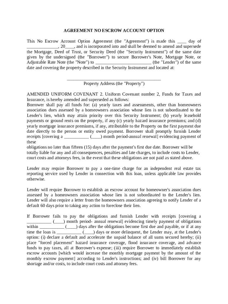 This form is used to amend and supercede the original mortgage to include a no escrow account option agreement between the Lender and Borrower.