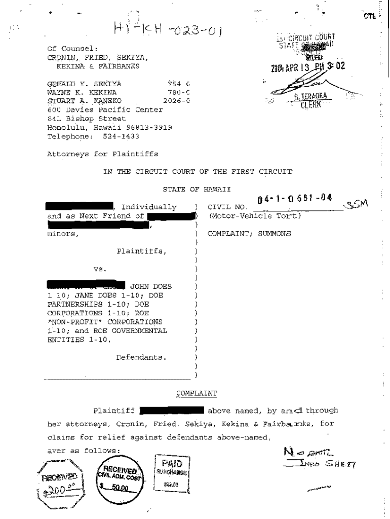 A01 Complaint for Personal Injury Due to Negligent Operation of Motor Vehicle