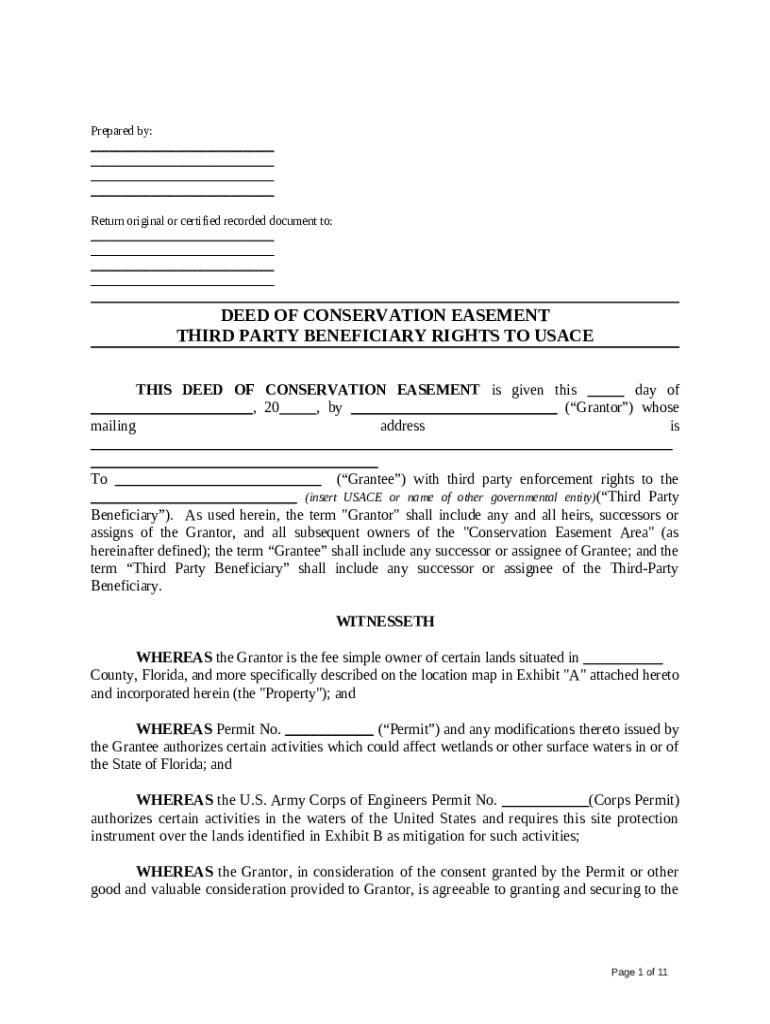 This Deed of Conservation Easement by a property owner provides rights to a conservation easement area for a grantee with third party enforcement rights to a stated Florida government agency ( or