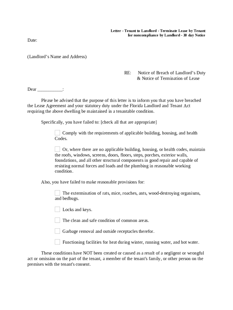Letter - Tenant to Landlord - Terminate Lease by Tenant for Noncompliance by Landlord - 30 Day Notice: This is a sample letter to be sent to a Landlord, by a Tenant, when the Landlord has breached
