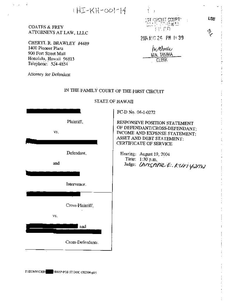 A14 Responsive Position Statement of Defendant Cross-Defendant - Income Expense and Asset and Debt Statements